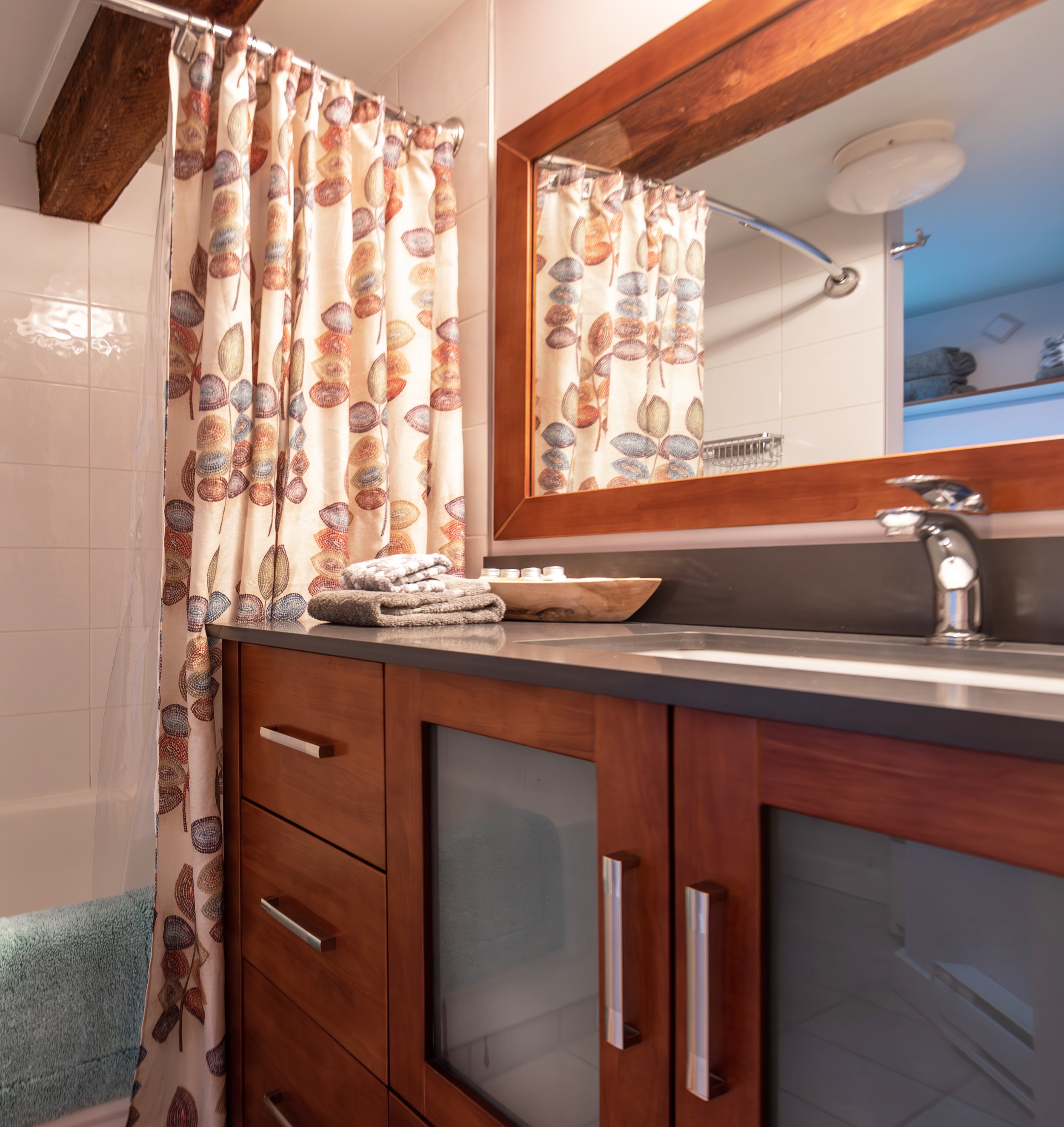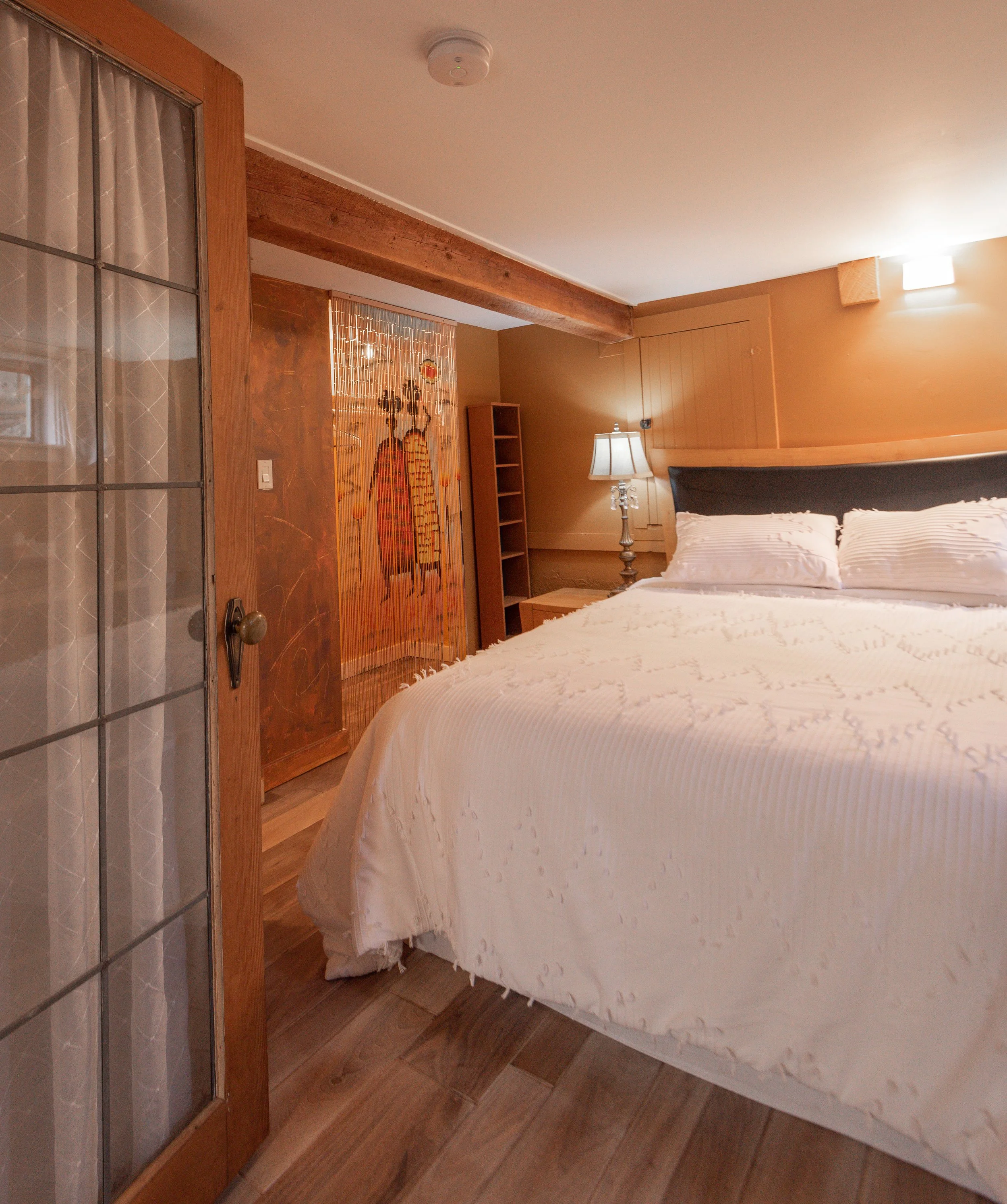 Follow the path through the beautiful garden that will lead you to the suite. Open the french doors and step into the living room featuring an electric fire place, tv and comfy lounge furniture and sofa couch for extra guests. Through the living room you will find the full kitchen, dining area and dedicated workspace. The queen bedroom has ample closet space and french doors to keep the bedroom private from the rest of the suite. There is access to the shared washer and dryer for use as well as an ironing board.